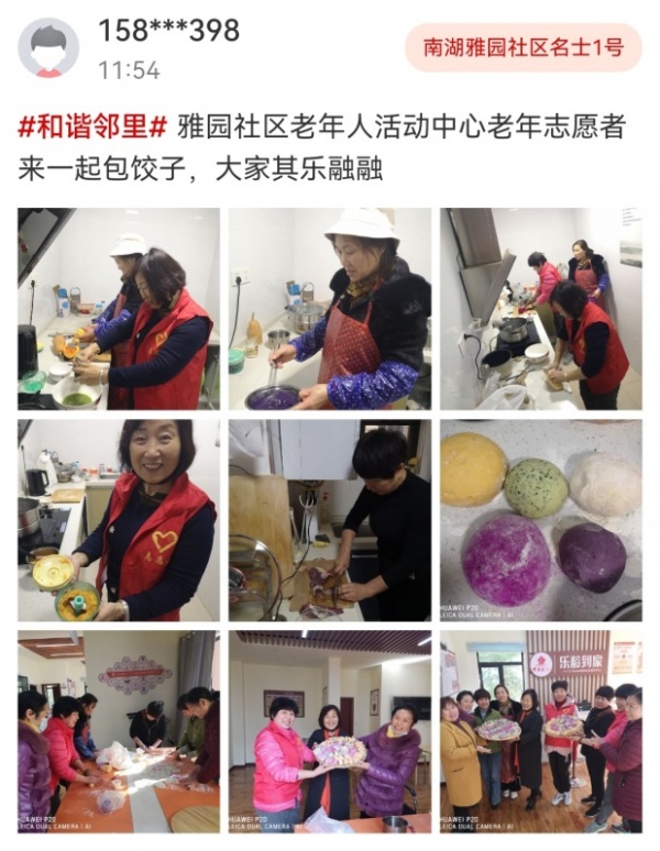 南湖雅园社区不甘其后,组织老年人活动中心的志愿者一起包了饺子,五颜六色,像彩虹一样好看。