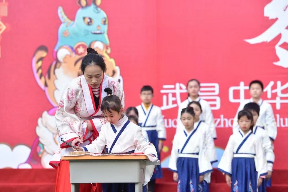 武汉瑞景小学的师生们将校园布置成了中国传统庙会现场,粘布虎、舞皮影、识行头、纳香囊、消九寒五个民俗摊位和泥塑、面塑、剪纸、糖画四位非遗大师的摊位间隔分布,组成了一条庙会长街。学生不上课、无作业,徜徉在庙会中,时而看大戏,时而猜灯谜、剪窗花,体会着中国传统民俗的独特魅力。