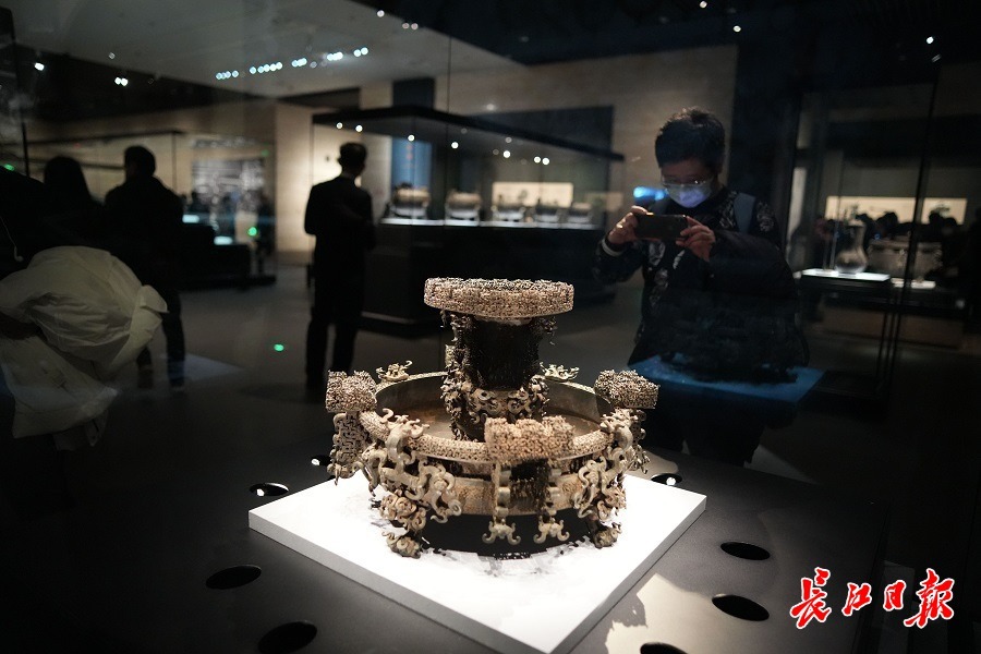 文博爱好者在十大镇馆之宝之一的曾侯乙尊盘前驻足拍照。长江日报记者何晓刚 通讯员黄敏 摄