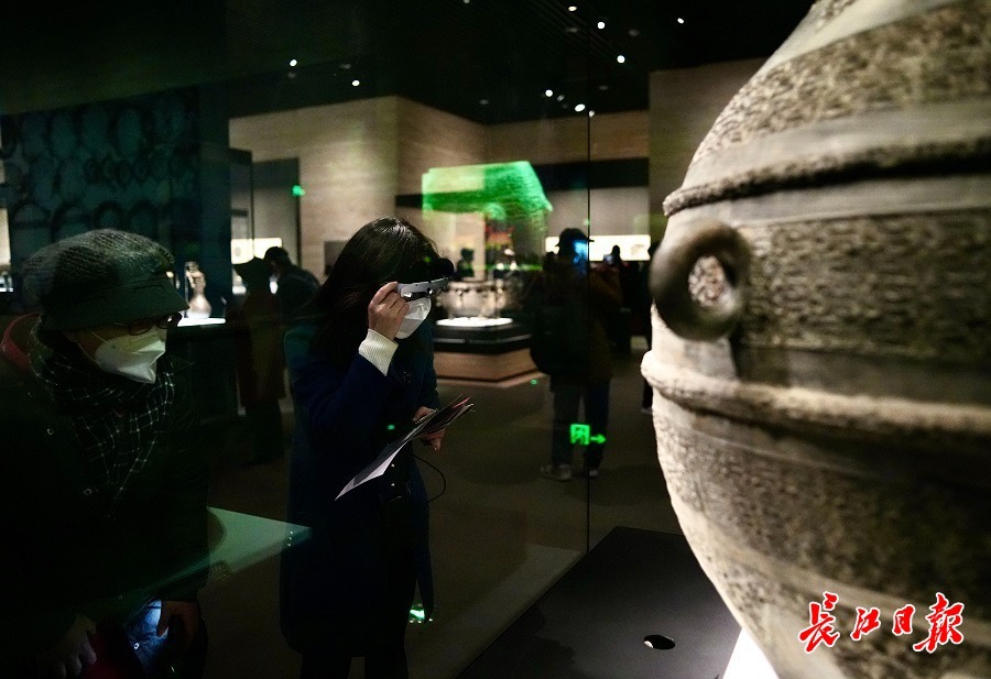 文博爱好者戴上VR眼镜观展。长江日报记者何晓刚 通讯员黄敏 摄