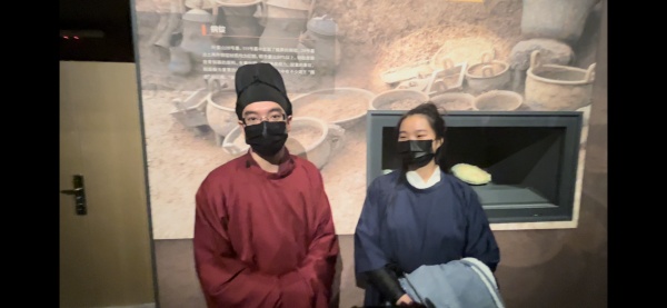 一对情侣穿着汉服在曾世家展厅观展,他们说12月21日正好是中国传统二十四节气的冬至,早就听说省博新馆要开,成功预约上了开馆第一天,就特意穿中国传统服装来,觉得和省博的环境比较搭。