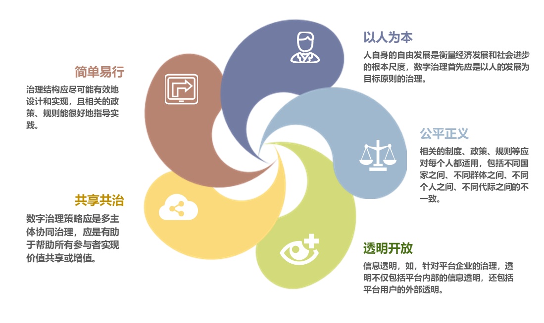 报告认为“数字治理”的概念是指,数字技术条件下,以政府为主导,平台与企业、社会组织、网络社群、公民个人等多元主体协同参与相关事务的制度安排和持续过程,是包括宏观、中观、微观各个层面治理的系统性议题,应坚持以人为本、公平正义、透明开放、共享共治、简单易行等五项基本治理原则。