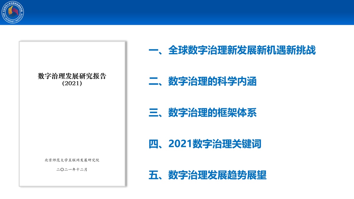 此次论坛设立了“数字治理与数字社会”分论坛,北京师范大学互联网发展研究院副院长李睿深代表数字治理课题组发布了《数字治理发展研究报告(2021)》。报告全文约3万字,包含全球数字治理新发展新机遇新挑战,数字治理的科学内涵,数字治理的框架体系,2021数字治理关键词,数字治理发展趋势展望等五个部分。对数字治理的实践进展、理论探索和未来趋势进行了全面梳理。