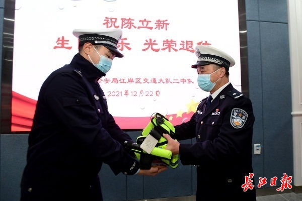 22日中午,江岸区交通大队二中队的全体在队民警辅警为陈立新举行了简短而隆重的荣休仪式,向他致敬。仪式上,陈立新慢慢取下陪伴了自己40年的警用装备,双手交给新参警民警刘旭。“希望你继承和发扬优良传统,今后做得比我更好!”现场全体战友起立向他敬礼。