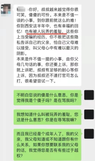 原来,在协商无果后,小程请人写好了起诉状。据源点新闻报道,11月12日,任某主动给小程发微信称,“你刚开始走上社会什么都不懂,叔叔在等你上(起)诉。”12月8日,任某给小程发微信说,“你好,叔叔越来越觉得你很可笑,傻傻的可怜。本来是不值一谈的小事,到你跟前就这么的难,你到西安这半年中,也有幸福的回忆,也有被人玩弄的羞耻,这些你上当受骗的经历,你不敢把这些隐私告诉自己的父亲,怕自己父母难以接受,叫父母心中有难以磨灭的阴影。”【详细报道】