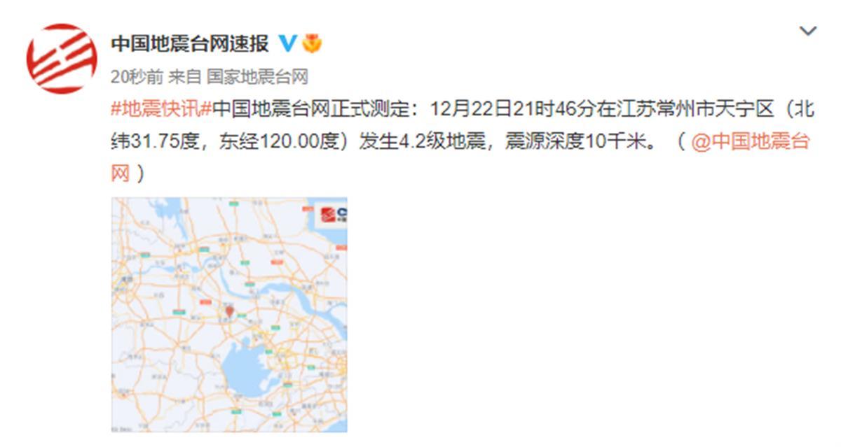 据中国地震台网速报消息,12月22日21时46分在江苏常州市天宁区发生4.2级地震,震源深度10千米。