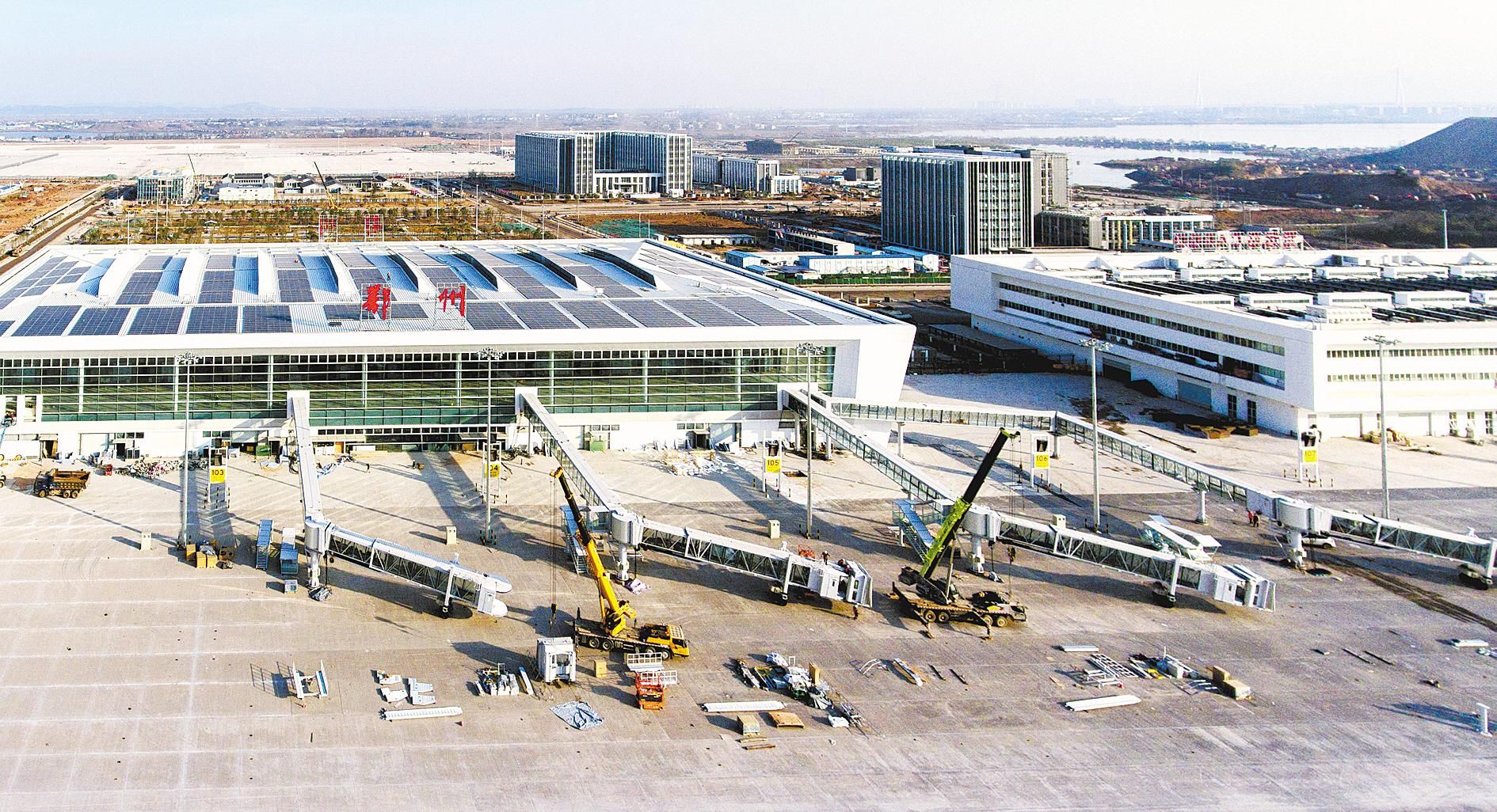 12月20日,鄂州花湖机场航站楼关键设施——登机廊桥中的4个已经安装到位,剩余2个将于近日安装完毕。