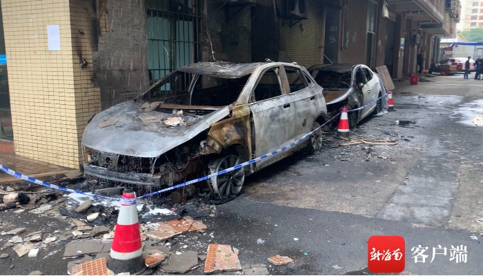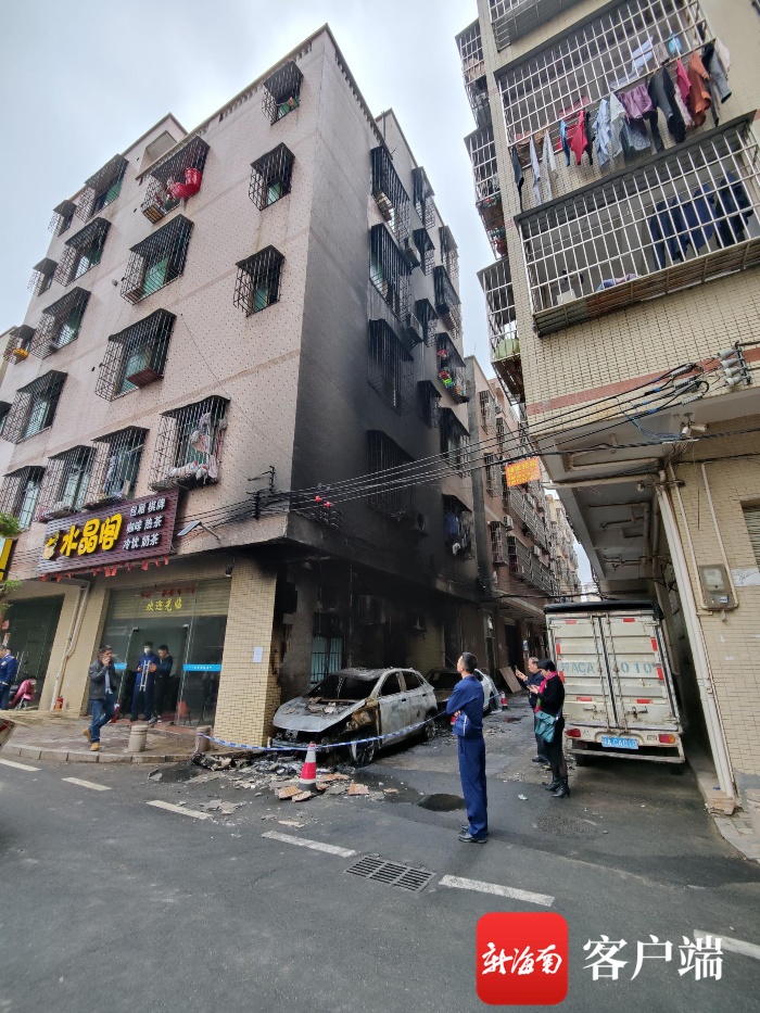 记者来到现场看到,该起火车辆已经烧成残骸,受到波及的还有停靠在该车后的另一辆轿车,也被烧至大面积损毁;靠近车辆一侧建筑楼体至六层外立面被烧黑,部分玻璃窗、空调外机、电线、监控探头等被烧毁……