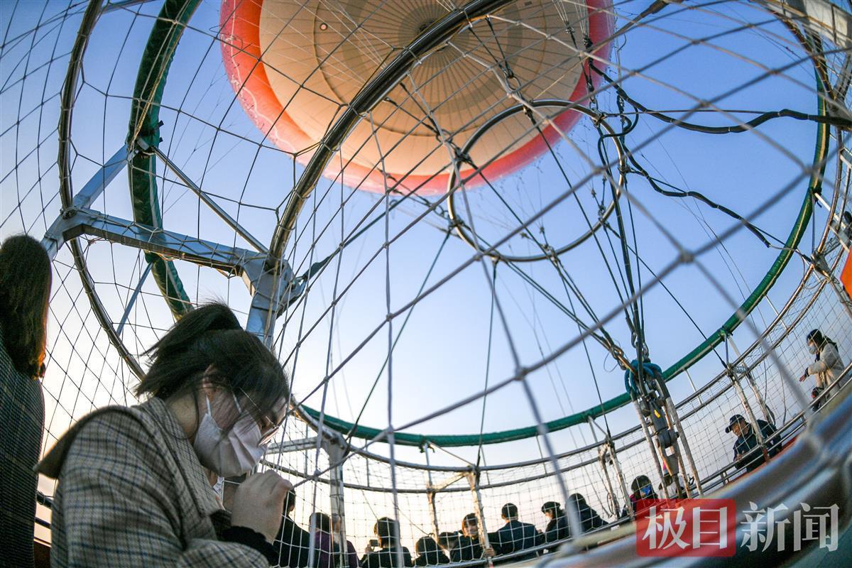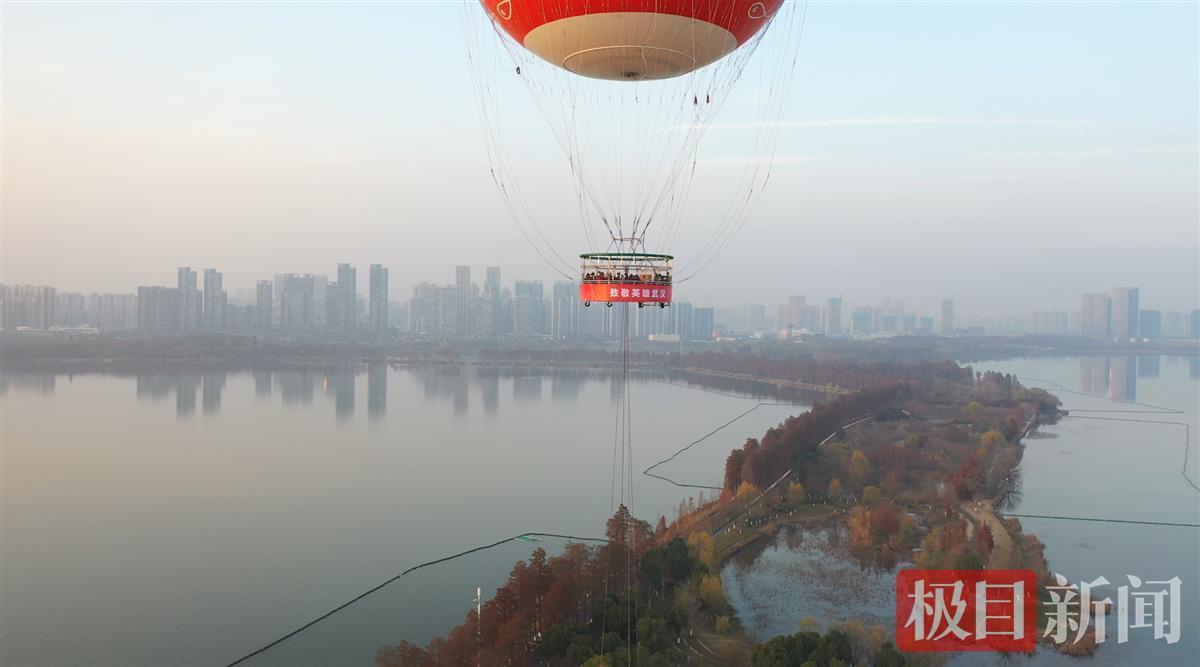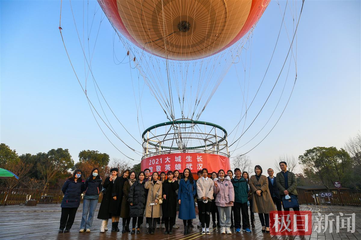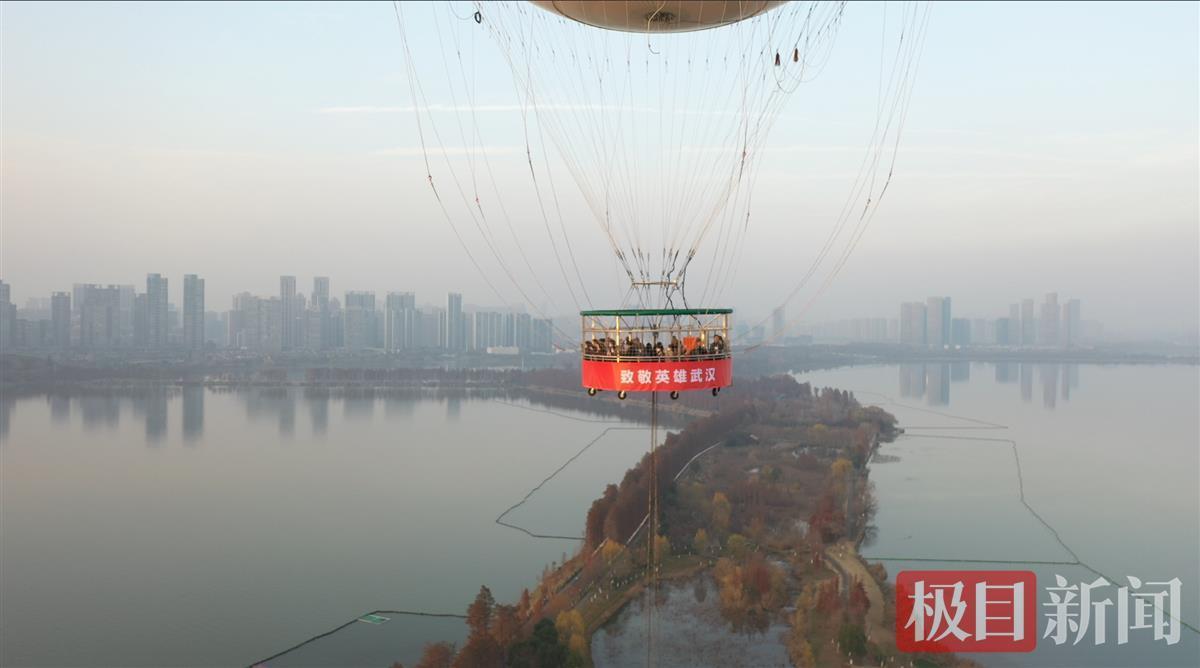 参加《2021·大城生长》致敬礼活动的嘉宾代表,登上东湖氦气球,随着气球缓缓升空,大家从“天空视角”360度俯瞰大武汉的美景和城市风貌。