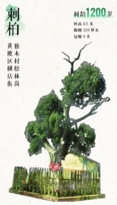 1、黄陂区横店街独木村松林岗,刺柏,1200岁,树高8.5米,胸围320厘米,冠幅9米。