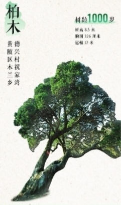 7、黄陂区木兰乡德兴村祝家湾,柏木,1000岁,树高8.5米,胸围326厘米,冠幅12米。