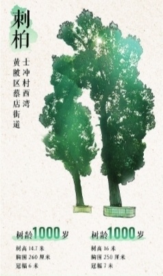 10、黄陂区蔡店街道士冲村西湾,刺柏,1000岁,树高16米,胸围250厘米,冠幅7米。