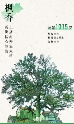 5、新洲区仓埠街上店村郑家大湾,枫香,1015岁,树高25米,胸围388厘米,冠幅21米。 82岁的村民曾承晏:我是被这株树看着长大的,从小就住得离树近,后来搬了一次家,成了树的邻居。我年轻的时候在村小学教书,经常带着学生来给这株树培土。它秋天叶子会变红,好看得很,夏天这里的树荫最浓,傍晚的时候几乎全村都来这里乘凉。以前村里每年元宵节,父老乡亲们都敲锣打鼓、张灯结彩,在树下祈求风调雨顺、平安健康。