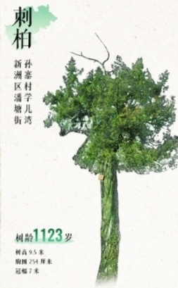 2、新洲区潘塘街孙寨村学儿湾,刺柏,1123岁,树高9.5米,胸围254厘米,冠幅7米。