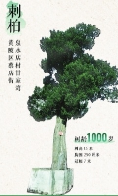 8、黄陂区蔡店街泉水店村甘家湾,刺柏,1000岁,树高15米,胸围250厘米,冠幅7米。