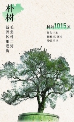 4、新洲区阳逻街毛集村二湾,朴树,1015岁,树高17米,胸围352厘米,冠幅22米。