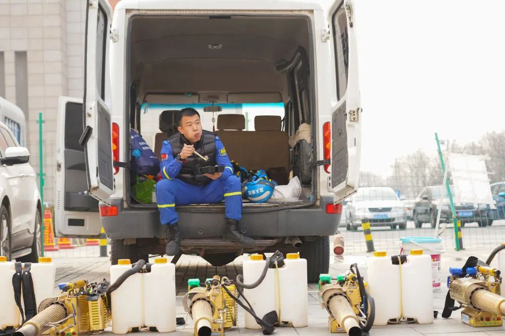 2月11日,在北京市丰台区一处文化产业园,完成消杀任务的郭猛坐在货车上吃饭。