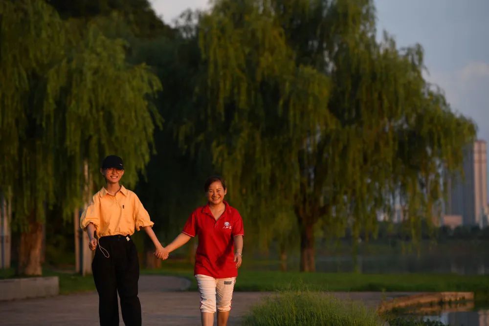欧阳程程(左)和妈妈方慧霞在公园内散步。2019年,在安徽省安庆一中读高二的她突患白血病。求助信息发布后,全城牵挂,众多爱心人士为她捐献血小板和血浆。今年高考,她被武汉大学药学类专业录取。