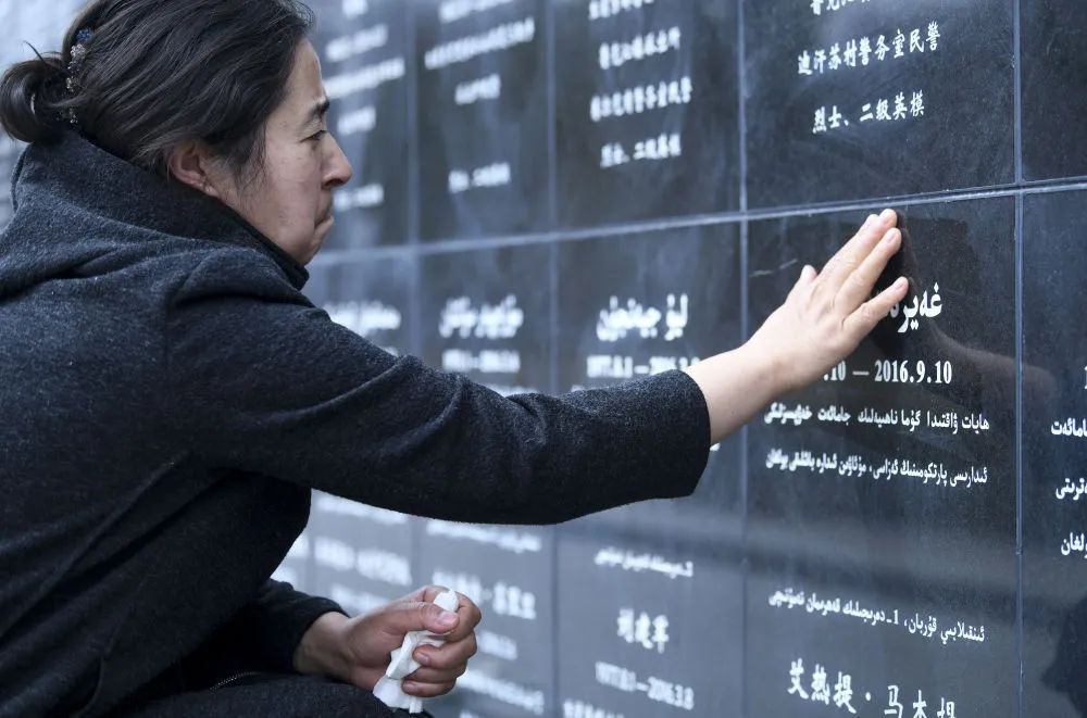 4月3日,玛依努尔抚摸镌刻在新疆公安英烈纪念碑上她的丈夫——艾热提的名字。