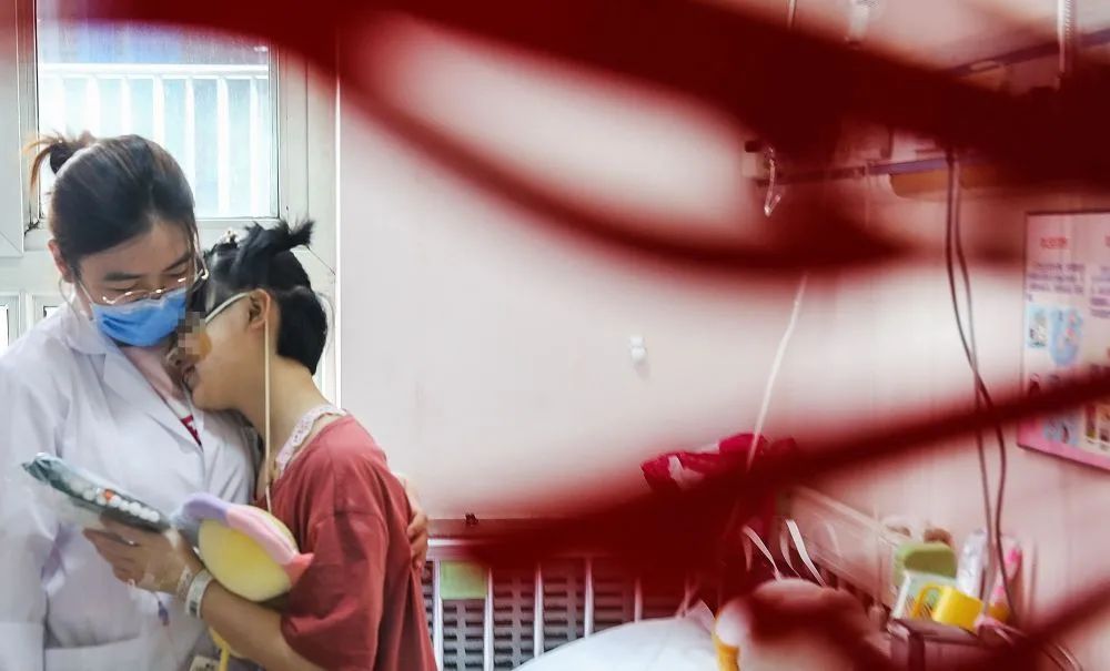 一名患儿在北京儿童医院肿瘤外科的病房内拥抱医护人员。