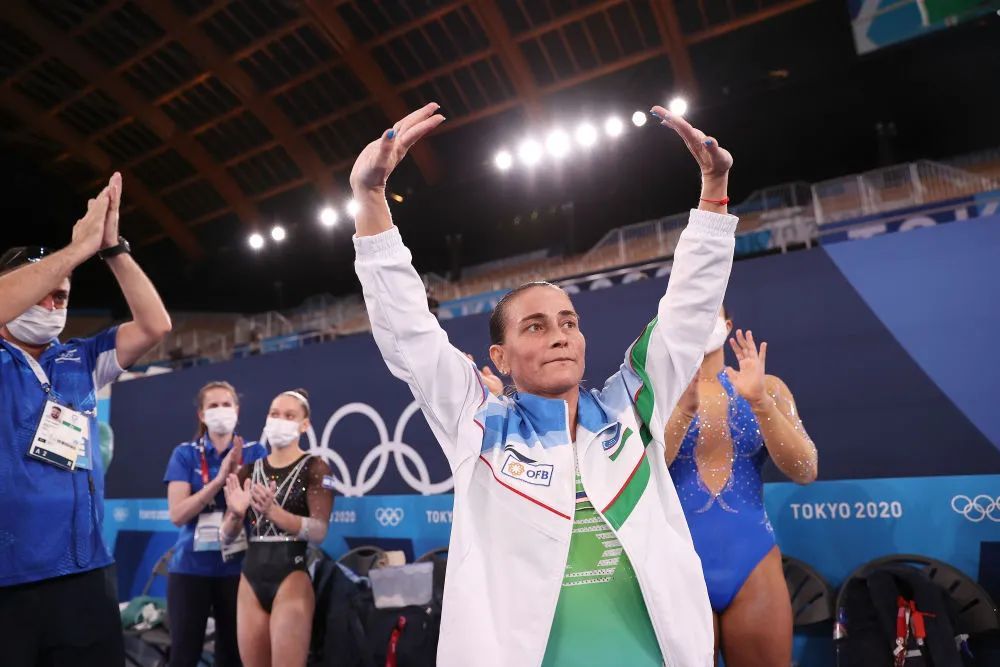 46岁的丘索维金娜在比赛后向观众致意。