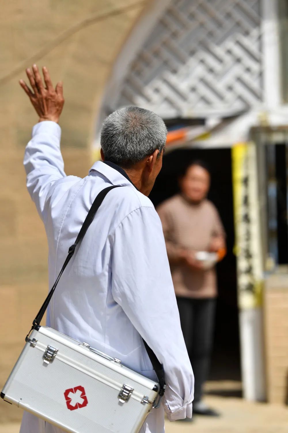 在山西省石楼县铁头村下铁头自然村,出诊结束后的张尚保和村民挥手告别。因为一场意外,张尚保失去了右手,但他咬着牙坚持了下来,45年来,日复一日地在山间穿行,为分散居住的村民们送医送药。