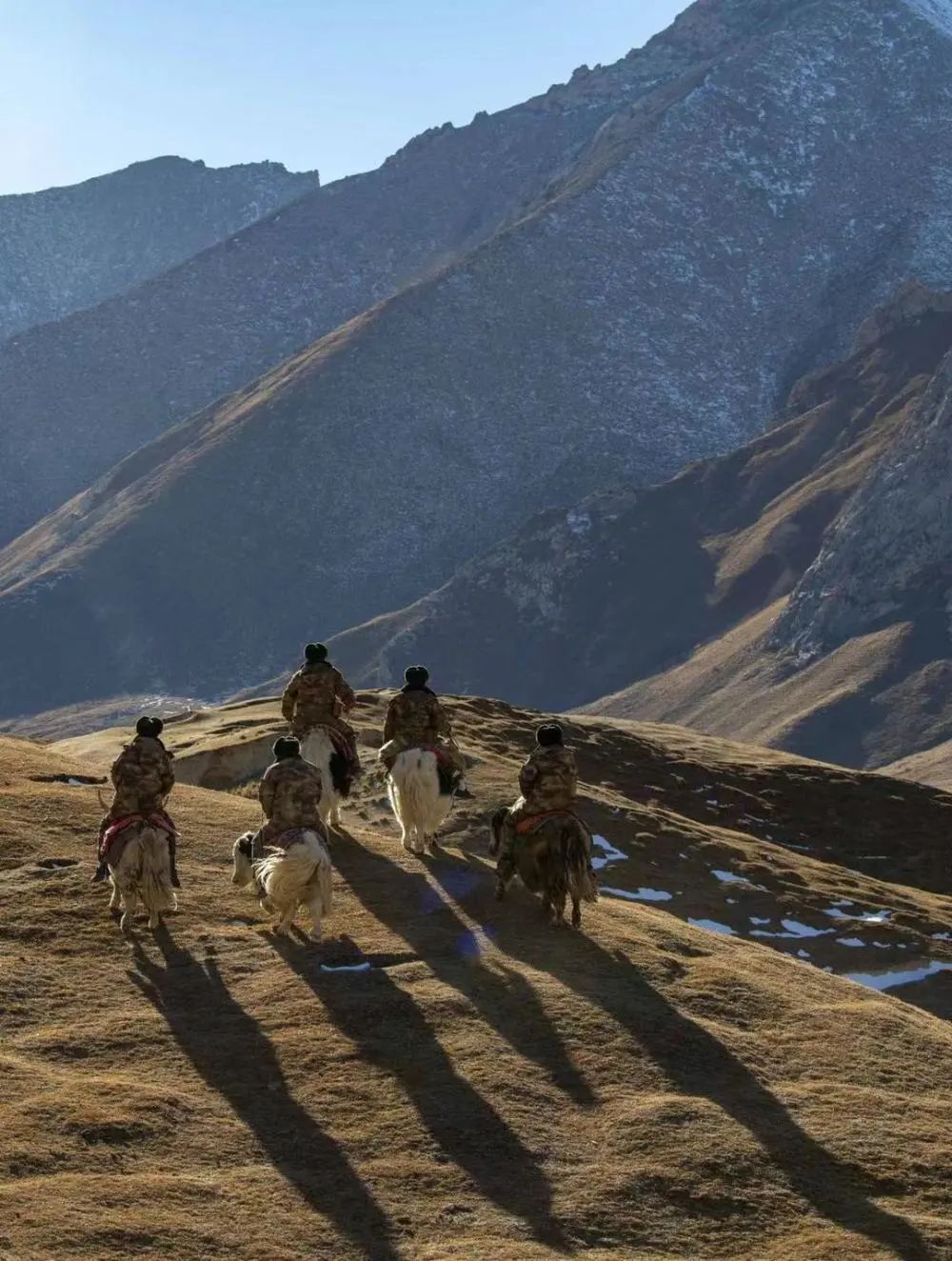 昆仑山腹地,“牛人”团队成员骑着牦牛行进在巡边路上。