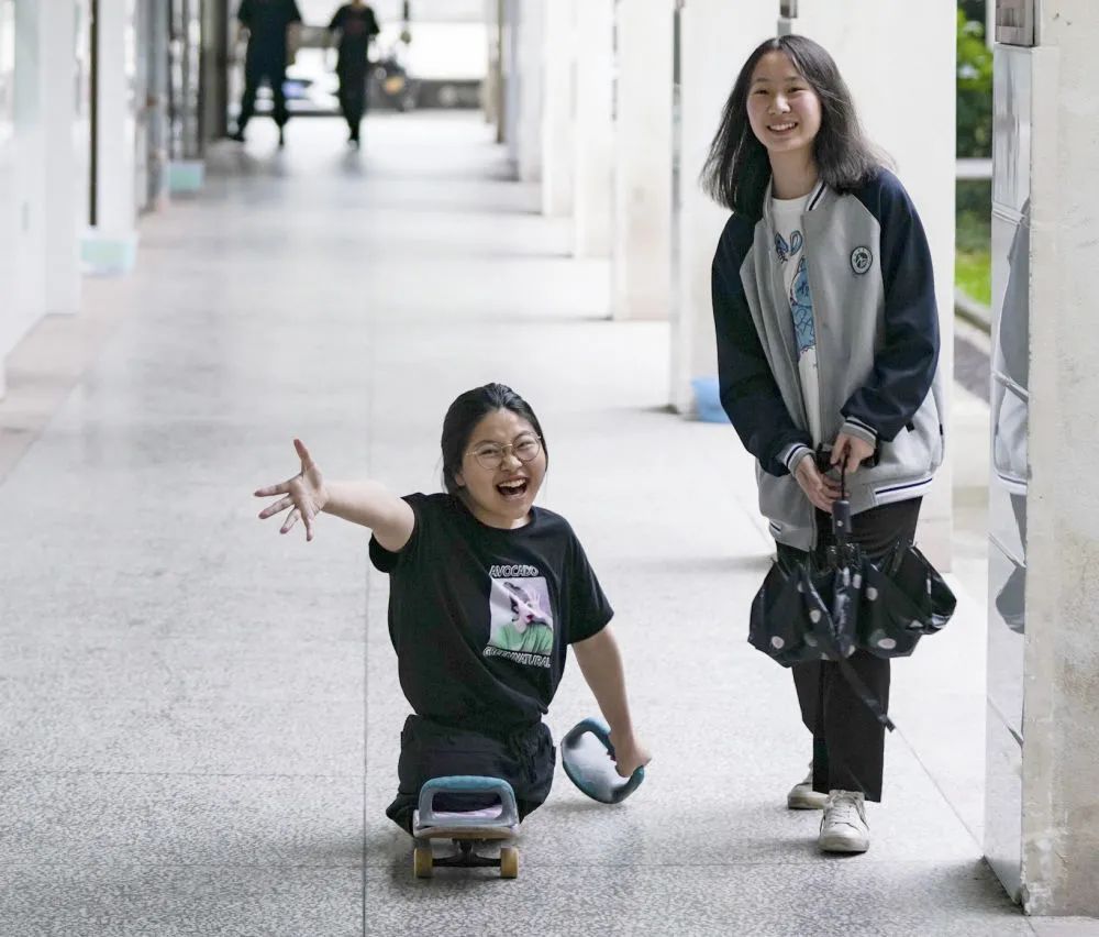 蒋张子怡(左)和同学在学校的走廊。16岁的蒋张子怡是江西上饶中学高中一年级的学生。2010年一场车祸夺去了她的双腿,如今的她只能依靠滑板代步,用双手前行,为此,大伙都称她“滑板姑娘”。
