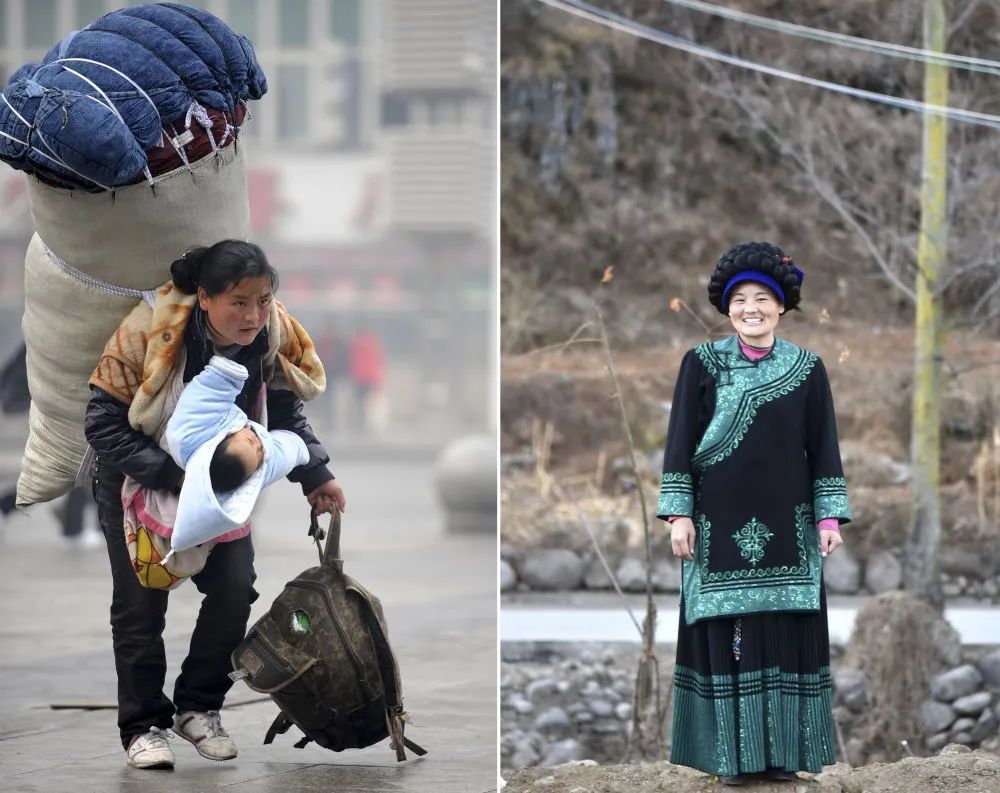 左图为2010年1月30日,巴木玉布木背着大包、抱着孩子在南昌火车站匆忙赶车;右图为2021年1月22日在四川省凉山彝族自治州越西县瓦岩乡桃园村拍摄的身着彝族服饰的巴木玉布木。