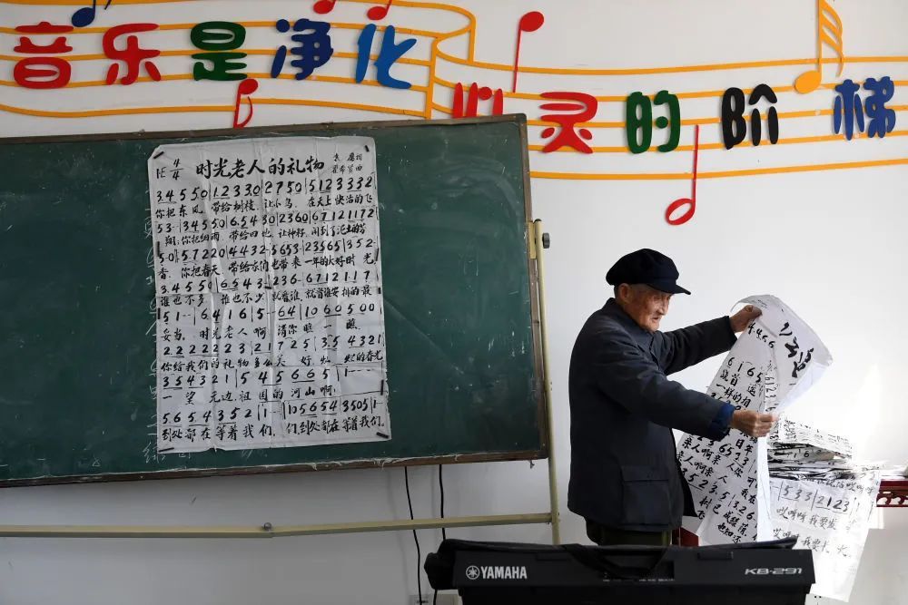 九旬老人严明友在音乐教室里整理自己手抄的歌谱。