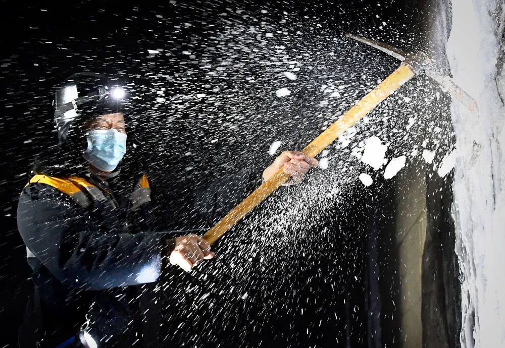 1月12日,中铁郑州局洛阳供电段和工务段员工郭振中在清除隧道壁上的冰柱。