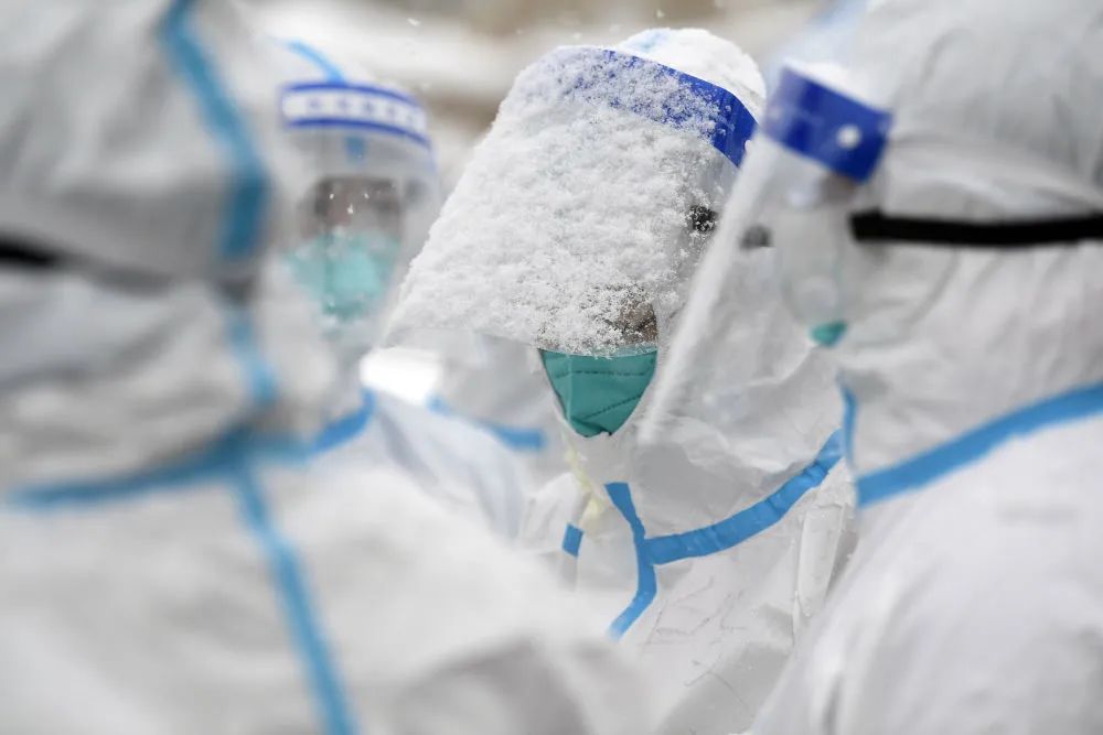 11月6日,在宁夏银川市兴庆区一处中风险小区门前,前来支援的医务人员在风雪中等候分配任务。