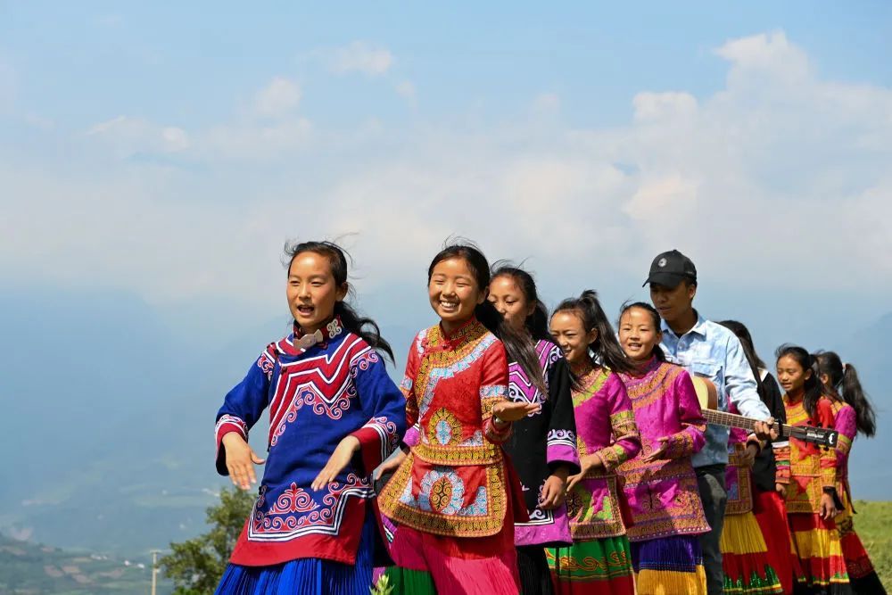 在四川省凉山彝族自治州普格县大槽乡,“妞妞”们和吉布小龙在户外唱歌。一直在外打拼的吉布小龙回到大山,一把吉他让留守女孩的歌声更加嘹亮。