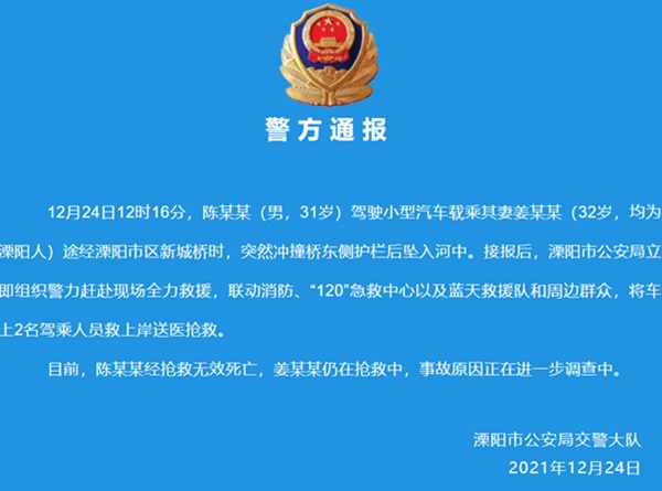 据江苏常州溧阳公安微警务微信公众号消息,12月24日12时16分,陈某某(男,31岁)驾驶小型汽车载乘其妻姜某某(32岁,均为溧阳人)途经溧阳市区新城桥时,突然冲撞桥东侧护栏后坠入河中。接报后,溧阳市公安局将车上2名驾乘人员救上岸送医抢救。目前(截至警方发布通报),陈某某经抢救无效死亡,姜某某仍在抢救中。