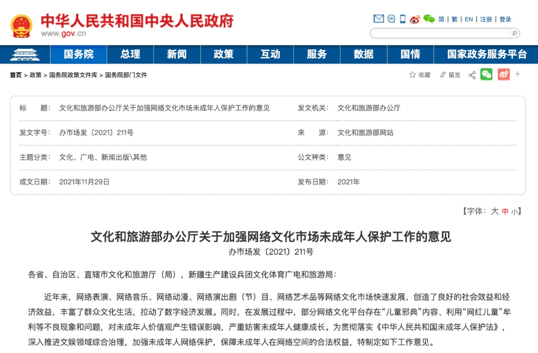 11月29日,文化和旅游部发布《关于加强网络文化市场未成年人保护工作的意见》,提出严禁借“网红儿童”牟利。对出现未成年人单独出镜或者由成年人携带出镜超过一定时长且经核定为借助未成年人积累人气、谋取利益的直播间或者短视频账号,或者利用儿童模特摆出不雅姿势、做性暗示动作等吸引流量、带货牟利的账号依法予以严肃处理。(点击文末“阅读原文”,查看全文)