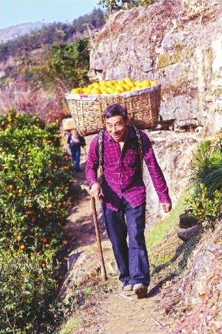 正逢冬季橙子采摘季,秭归村民背橙子出山