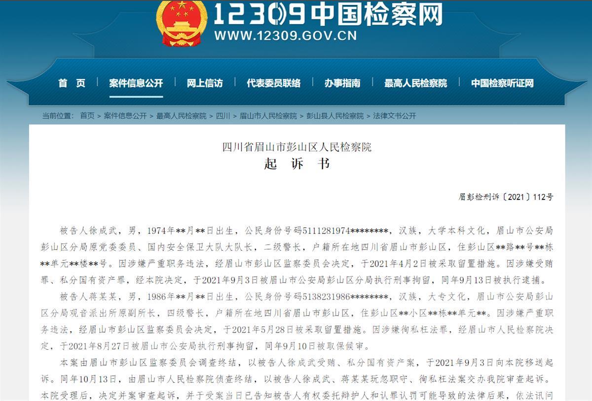 据眉山市彭山区人民检察院起诉书显示,47岁的徐成武系眉山市公安局彭山区分局原党委委员、国内安全保卫大队大队长,二级警长。因涉嫌严重职务违法,经眉山市彭山区监察委员会决定,于2021年4月2日被采取留置措施。因涉嫌受贿罪、私分国有资产罪,于2021年9月3日被眉山市公安局彭山区分局执行刑事拘留,同年9月13日被执行逮捕。