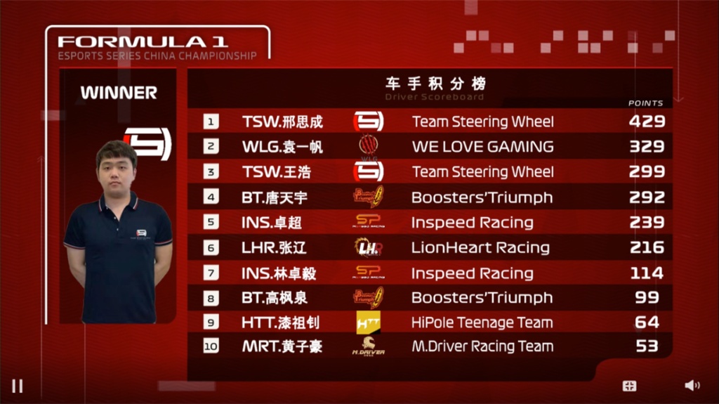 新科总冠军的邢思成在赛后表示“希望代表F1电竞中国代表队参加世界选秀,中国已经有了第一位F1车手,中国F1电竞车手也需要走向世界舞台!”