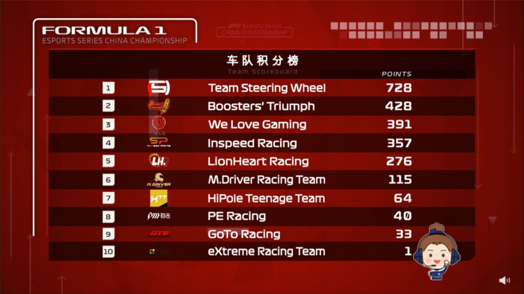 最终F1电竞中国冠军赛2021赛季正式告一段落,年度车队总冠军花落TSW车队,年度车手总冠军是来自TSW车队的邢思成。