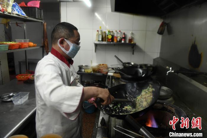 外卖店厨师在夜晚加班加点制作餐食。 蒋雪林 摄