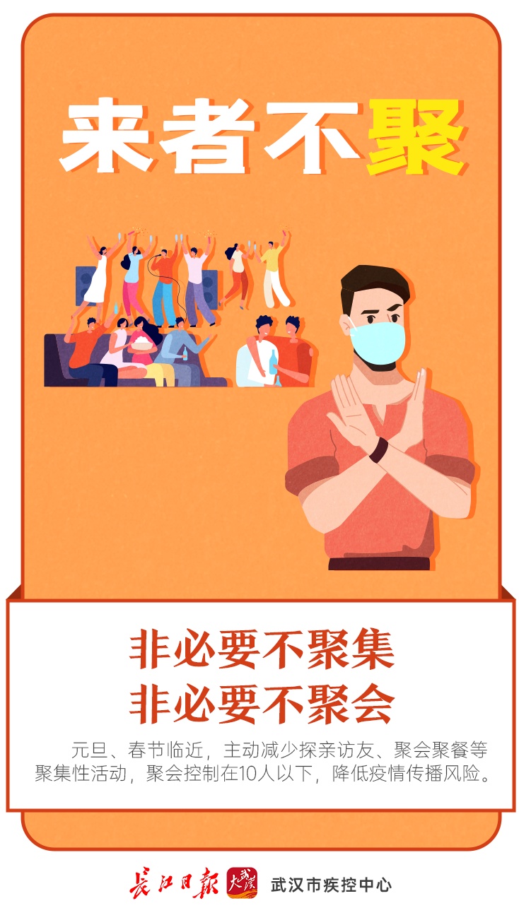 长江日报大武汉客户端12月28日讯(记者武叶 通讯员王敏)日前,武汉市疾控中心发布元旦假期温馨提示,跨年夜汉口江滩、江汉关、光谷步行街等公共场所不举办任何形式的大型群众性活动,提醒广大市民尽量不要前往。