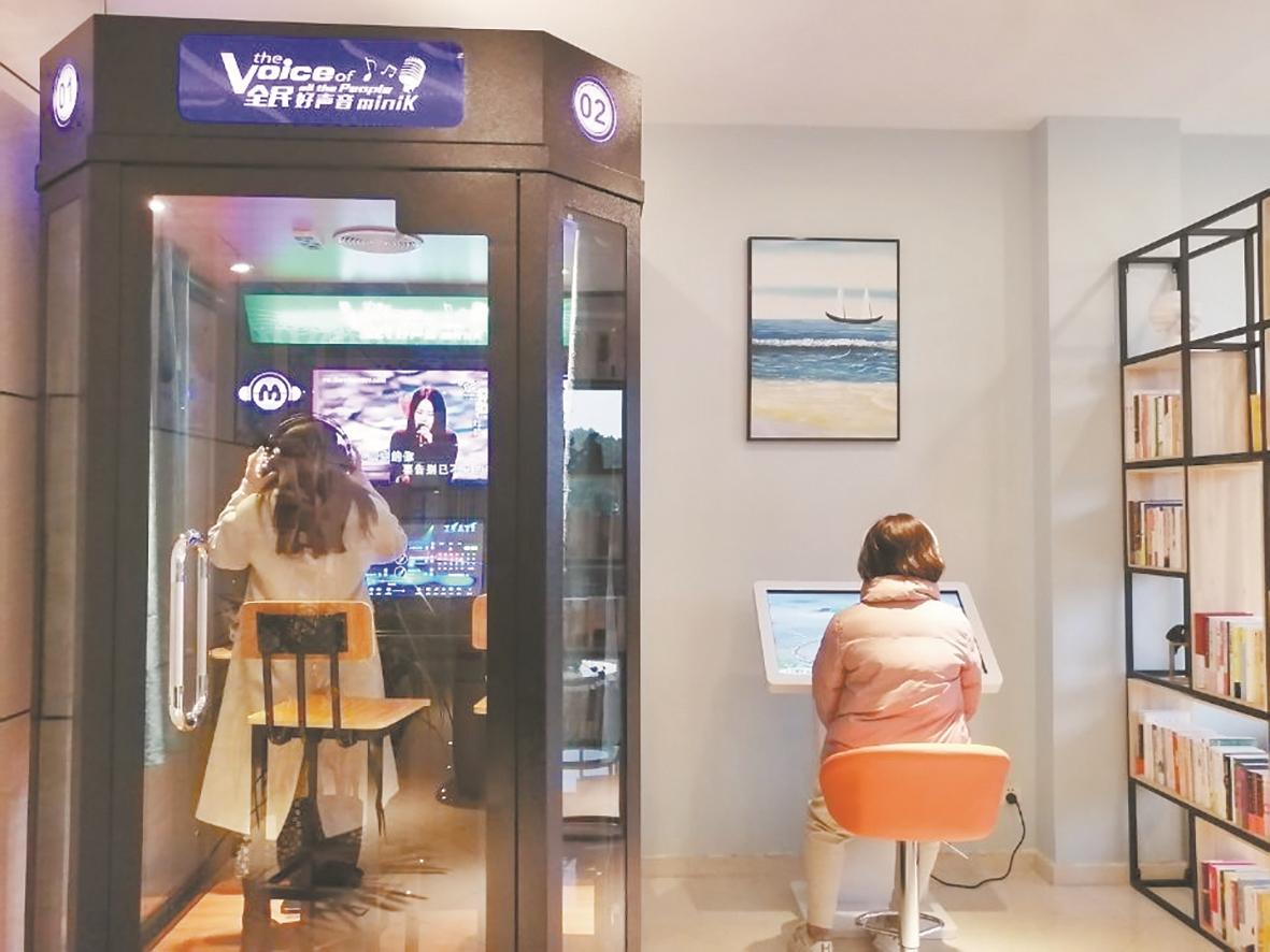 12月25日,记者探访时,看到有读者正在体验一台用于心理测试与调试的电子屏,戴着耳机和感应器,电子屏中的小程序可以感知到读者的心情起伏变化,当体验者心情愉悦放松时,电子屏中的大树,开始长出了绿叶,地上的小草开始发芽;一旦体验者心理变得紧张,绿叶纷纷掉落……一旁还有一台自助K歌机,可供体验者独自释放压力。