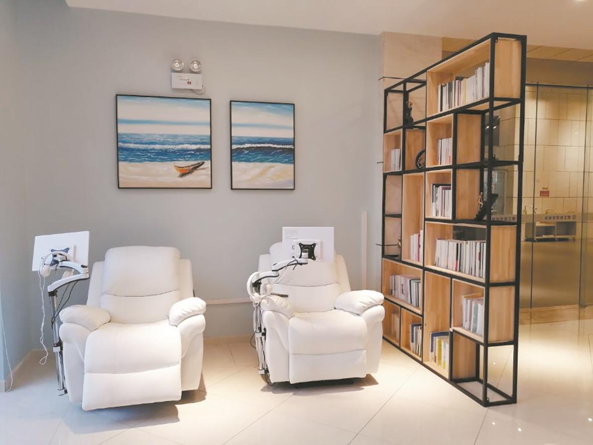 如果看书累了,读者可以躺在沙发上,听听音乐,看看电影。这里有两个柔软舒适的白色沙发,躺下来启动按摩功能,身心得到完全放松。