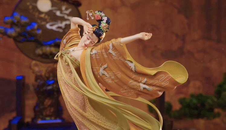 身着华服的女子随乐而舞,醉步轻点。一曲作罢,乘着月色返回天宫,带着裙摆飘起,如风吹仙袂,飘摇若举。