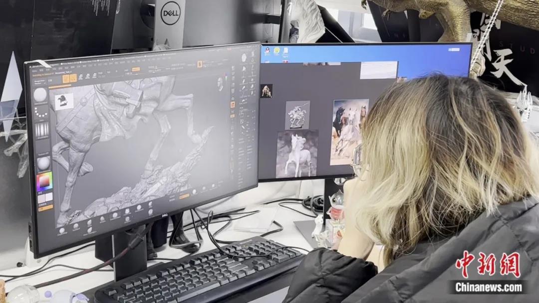设计师根据真人动作修饰雕塑手部细节 中新社 陈聪瑶 摄