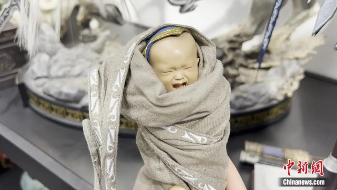 据开天工作室创始人朱佳麒介绍,这尊雕像的头发是一根一根植上去的,近十万根。在发际线和鬓角部分,他们还参考了真人发质,将多种毛发掺在一起,做出了胎毛的感觉。