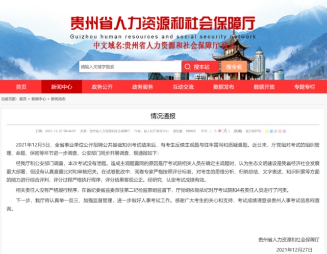 12月5日,贵州省事业单位公开招聘公共基础知识考试结束后,有考生反映主观题与往年雷同和质疑泄题。近日,经贵州省人社厅和公安部门对考试的组织管理、命题、保密等环节进一步调查,经调查,本次考试没有泄题。