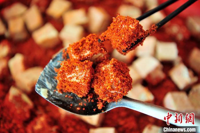 豆腐块变成蘸满调料的“红胖子”。张国荣 摄