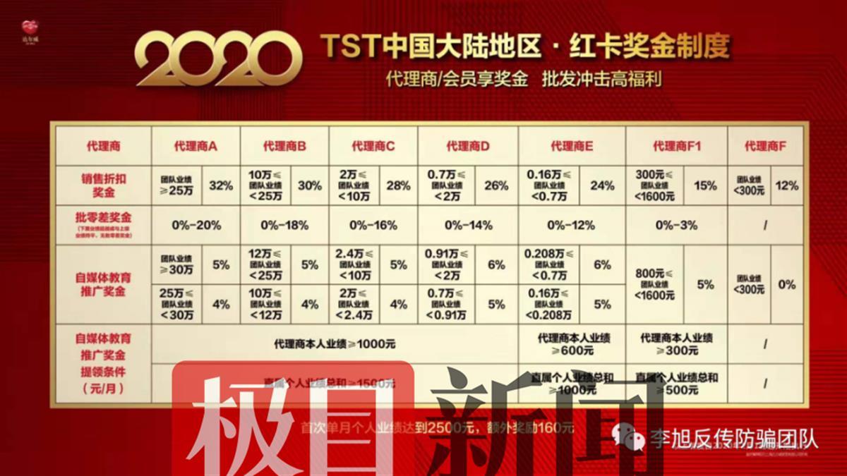 极目新闻记者从“李旭反传反骗团队”处查询到一份2020年TST奖金制度表,表格显示蓝卡代理的业绩提成有7个业绩范围,从最低的12%至32%不等。而红卡代理得的奖金由三部分组成:个人业绩提成、团队批零差奖金、自媒体教育推广奖,相关计算公式尤为复杂。