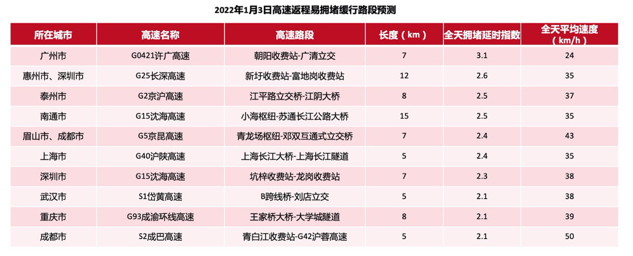 在元旦假期返程阶段,2022年1月3日返程易拥堵缓行的高速主要是G0421许广高速广州段(朝阳收费站-广清立交)、其次是G25长深高速惠州、深圳段(新圩收费站-富地岗收费站)、G2京沪高速泰州段(江平路立交桥-江阴大桥)等;建议行驶到以下路段的车主时刻注意路况,及时躲避拥堵。